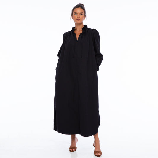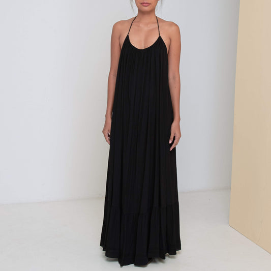LONG BACKLESS RUFFLED DRESS - Rayon Fujette Crepe | Black