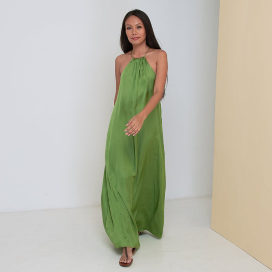DEEP V LONG HALTER DRESS - Rayon Viscose Satin | Moss Green