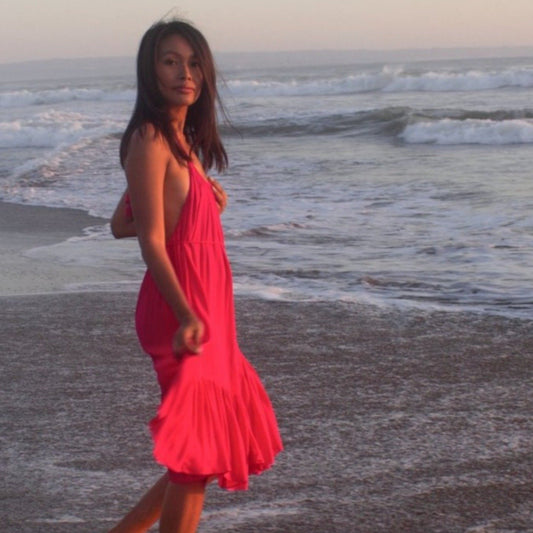 BACKLESS V LONG HALTER DRESS - Rayon Viscose Satin | Hot Pink