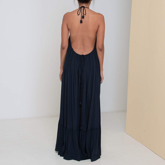 LONG BACKLESS RUFFLED DRESS - Rayon Fujette Crepe | Midnight Blue
