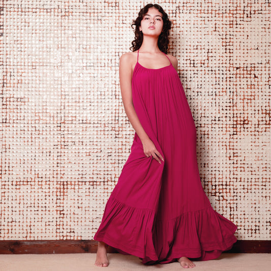 LONG BACKLESS RUFFLED DRESS - Rayon Fujette Crepe | Dark Raspberry