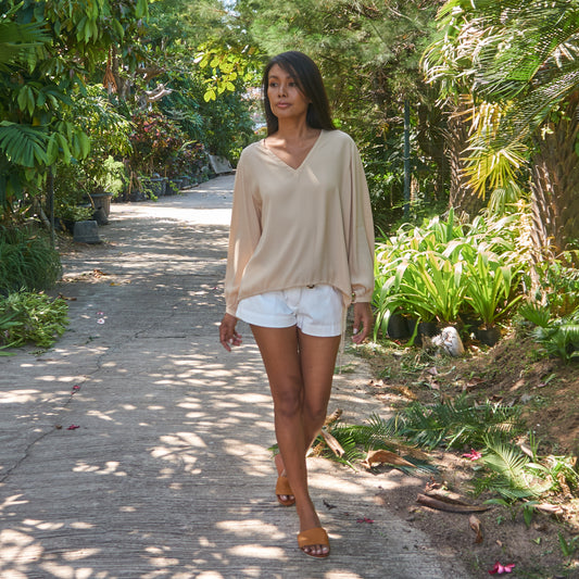 TEE V LONG SLEEVE TOP - Rayon Fujette Crepe | Beige
