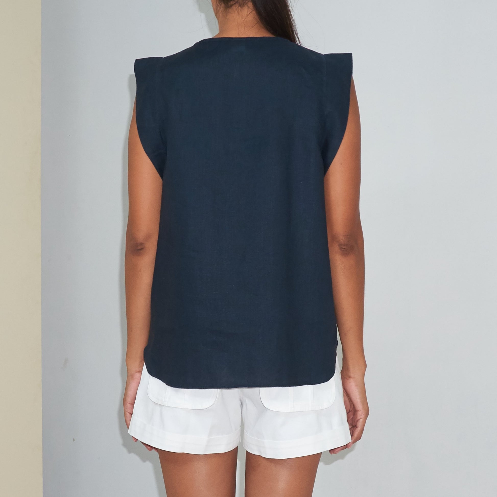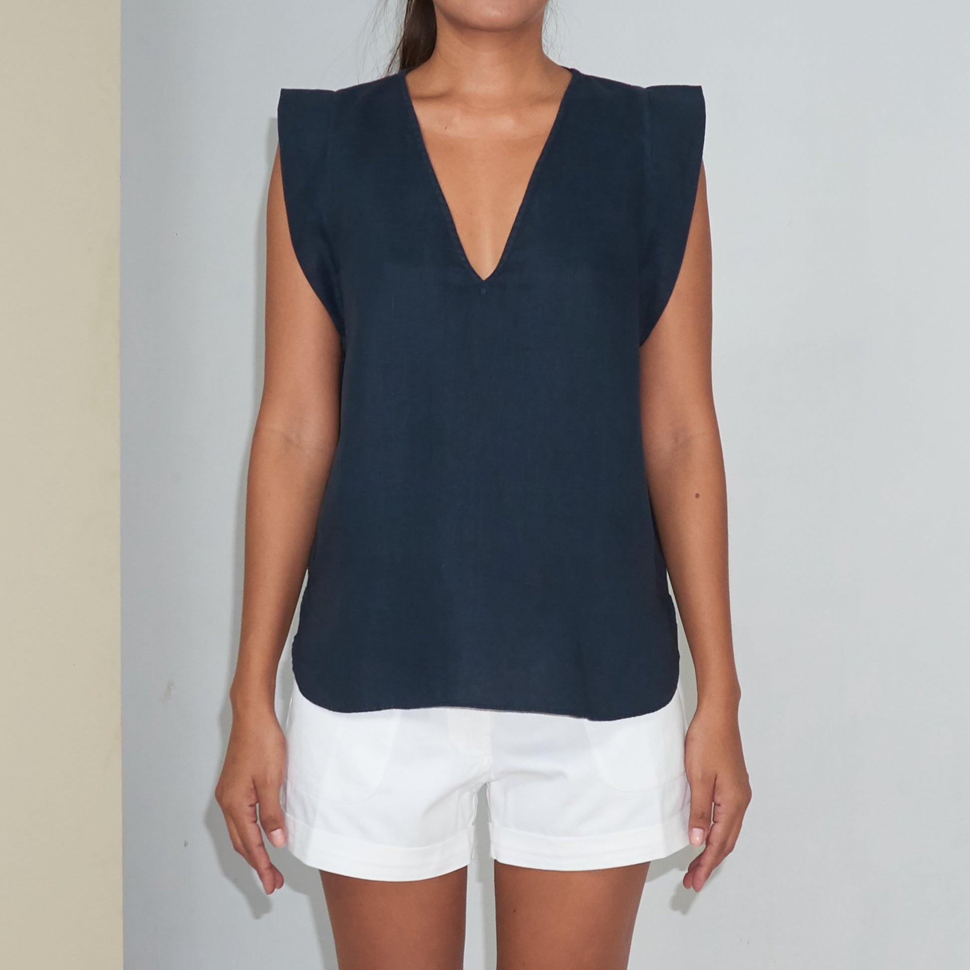 In pre-shrunk mid-weight linen, the TEE VS TOP is a tailored elevated t-shirt with sharp V-neckline, Japanese-inspired-winged-cap sleeves, and softly rounded hems. Linen follows the "wear. wash. repeat" motto.